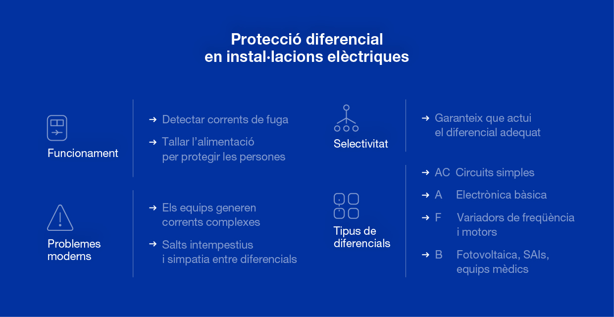 Escollir el tipus de diferencial adequat és clau per evitar interrupcions, millorar la fiabilitat i garantir la seguretat de les persones i de la instal·lació. Conèixer els fenòmens de simpatia, selectivitat i les característiques de cada tipologia és imprescindible per dissenyar instal·lacions modernes segures i estables.