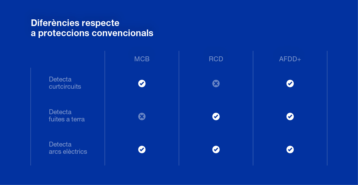 — Protecció específica contra arcs elèctrics, la seva funcionalitat diferencial
